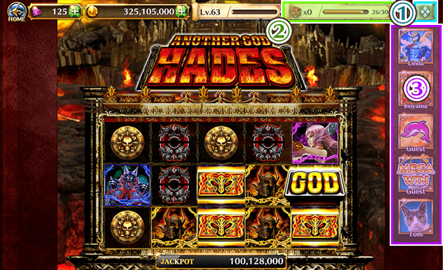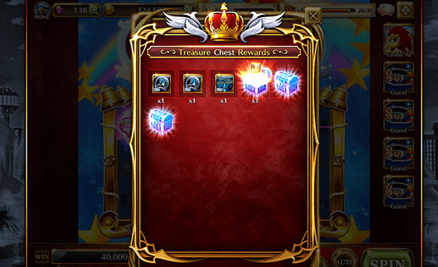 - 2. Treasure Chest... Shows Treasure Chests gotten while playing Slots, and a gauge that shows how long until the next Treasure Chest.